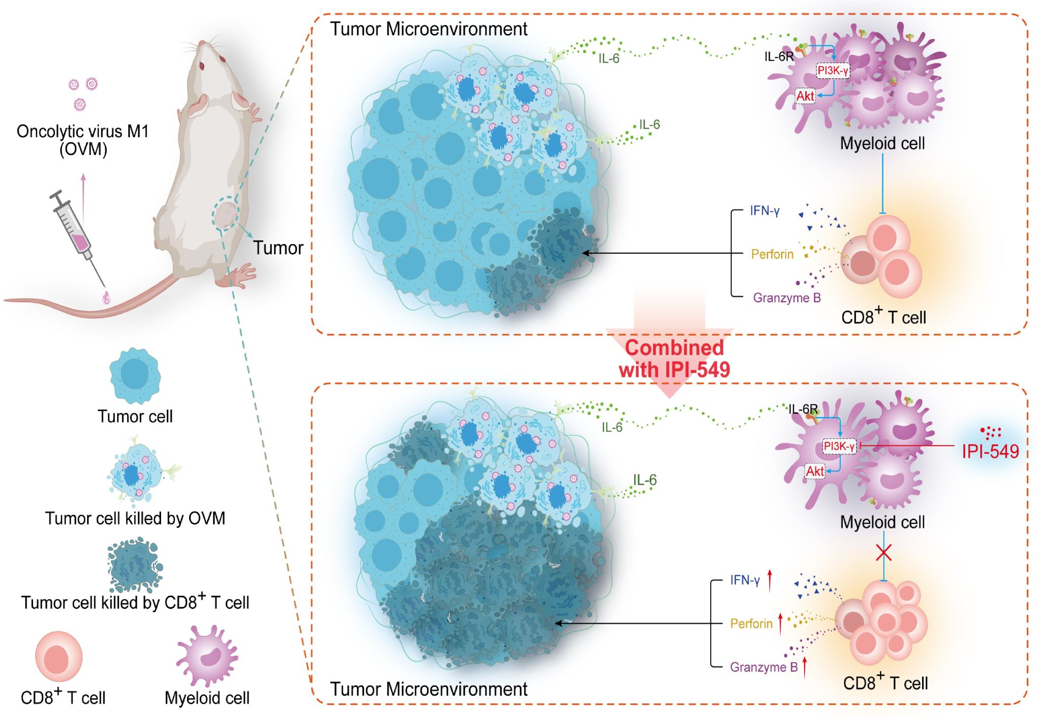 迄今为止,任何一种癌症治疗药物或早或晚都会产生抗药性,颜光美教授团队前瞻性地开展了未来可能对OVM产生抗药性的机理和方法。在本项研究中,研究团队首先确证了部分体外对OVM高度敏感的肿瘤细胞株在体内却抵抗 OVM 治疗。进一步的研究发现,肿瘤微环境中的髓系细胞(即肿瘤相关髓系细胞TAMCs)是限制OVM疗效的免疫抑制因素,且删除髓系细胞能大幅提高OVM的疗效。有趣的是,在对OVM治疗敏感和抵抗的肿瘤模型中,OVM处理均上调TAMCs的浸润,且OVM处理加剧了TAMCs的免疫抑制表型。转录组测序和验证性实验证实,OVM诱导肿瘤细胞分泌细胞因子IL-6,IL-6激活TAMCs中的PI3K-γ(该PI3K亚型仅存在于髓系细胞中)信号,进一步促进TAMCs迁移至肿瘤部位并加剧TAMCs对细胞毒性CD8+T淋巴细胞的抑制作用。在多种难治性恶性肿瘤模型中,靶向抑制PI3K-γ减少肿瘤浸润髓系细胞的比例,扭转其免疫抑制表型,进而显著增强OVM的疗效。进一步地,OVM联合 PI3K-γ抑制剂和免疫检查点阻断能治愈33.3%的三阴乳腺癌、83.3%的结直肠癌和62.5%的胰腺癌。在胰腺癌治愈鼠中再次接种10倍于初次接种细胞数量的胰腺癌细胞,肿瘤不能生长,说明治愈鼠出现了抗肿瘤免疫记忆。综上所述,该研究鉴定了肿瘤微环境中限制OVM 疗效的免疫抑制细胞和分子机制,并提供了通过解除髓系免疫抑制强化OVM溶瘤效应的多种用药策略,为解决溶瘤病毒研究领域中抵抗性和疗效限制这一共性问题提供了研究范式。