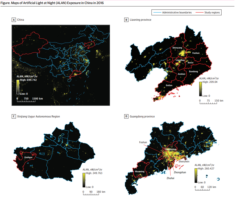 健康的睡眠对儿童身体发育和心理健康至关重要。目前的系统综述显示,我国儿童睡眠问题患病率约高达37.6%,已成为我国儿童青少年重大的公共健康问题。因此,识别导致睡眠障碍的影响环境因素,并对其进行有效干预具有非常重要的理论和现实指导意义。基于此,bat365在线中国登录入口公共卫生学院董光辉教授团队在广东省、辽宁省和新疆维吾尔自治区(见图1)共选取14个城市55个行政区的201,994名儿童青少年,利用卫星图像评估了居住地址500m范围的室外夜光暴露,并进一步探讨了室外夜光和儿童青少年睡眠障碍及其亚型的关联性。