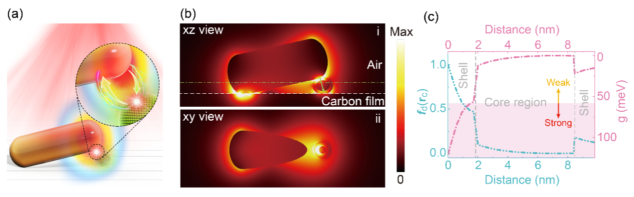 图 1 (a) 单根金纳米棒与单个量子点形成“锲形腔”构型的强耦合示意图;(b) 单个Au NR@QD1结构的x-y、x-z电场分布图,其中量子点被压在金棒一端的下方。(i)中的绿色虚线是电场分布的x-y视图数据提取的平面;(c) 归一化电场、耦合强度与距离(沿(b)中绿色箭头从金棒到量子点中心)的关系图。灰色竖虚线中间为量子点核区域,粉色区域示意系统达到辐射强耦合状态。