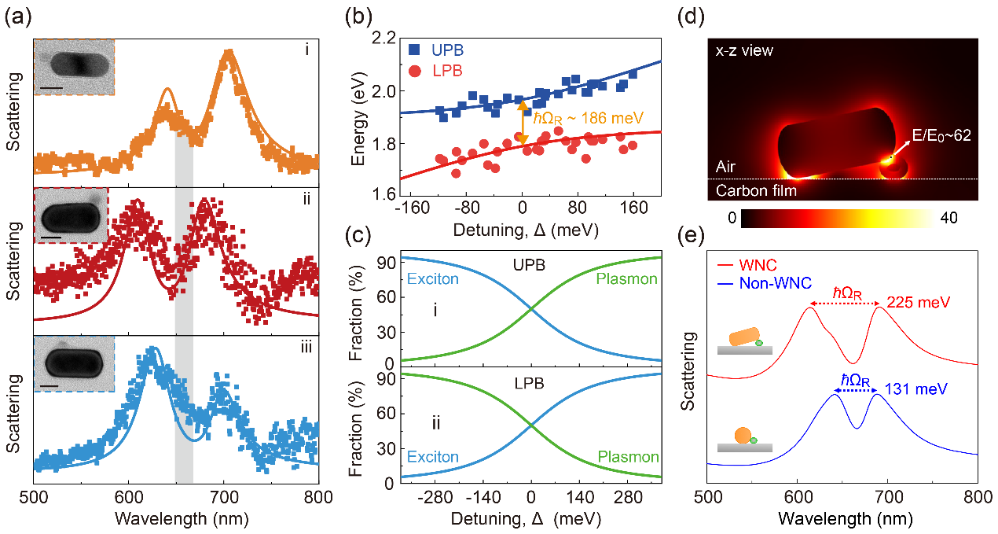 图 2 (a) 不同失谐量情况下单个Au NR@QD1杂化系统的暗场散射测量结果,其中图(ii)中的光谱劈裂高达~234 meV;(b) 实验数据(点图)及理论计算(线图)得到的杂化系统色散关系;(c) 色散关系上支(UPB)与下支(LPB)中的等离激元模式、量子点激子的相对占比;(d) “锲形腔”构型的电场分布图;(e) 室温下“锲形腔”构型与非“锲形腔”构型的Comsol仿真散射谱结果