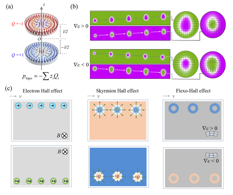 图2:挠曲霍尔效应:(a)反铁磁耦合的斯格明子示意图;(b)不同弯曲方向下斯格明子的运动方向理论计算结果;(c)电子霍尔效应、斯格明子霍尔效应与挠曲霍尔效应示意图,三种效应的偏转方向分别取决于电荷、拓扑荷和应变梯度方向。