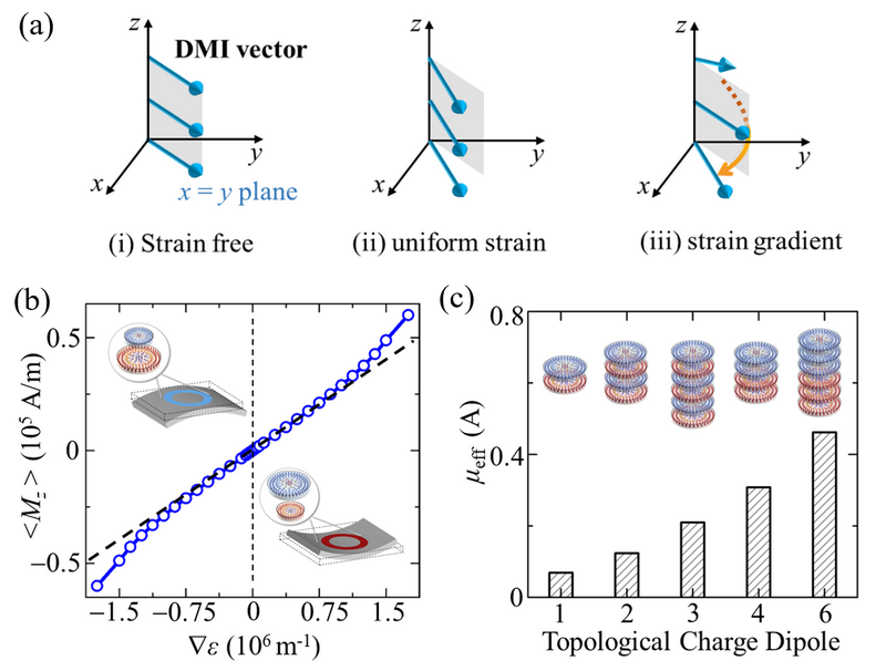 图1:挠曲磁效应: (a)不同应变状态下的DM作用;(b)净磁化随应变梯度响应的理论计算结果;(c)等效挠曲磁系数的拓扑增强效应。