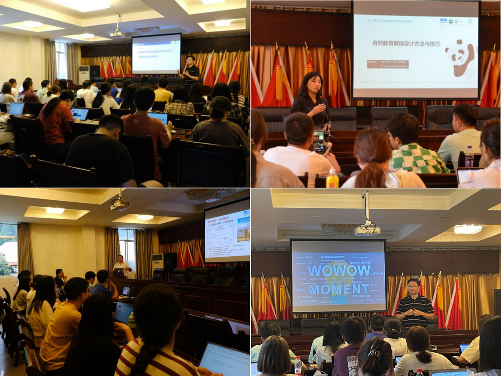 工作坊期间,华南师范大学旅游管理学院院长、国内研学旅游研究专家刘俊教授受邀以“遗产地研学课程设计与实施”为题带来专题讲座。刘俊教授围绕“什么是研学旅行、什么是研学课程、研学旅行活动课程本质、研学课程/方案设计要素、遗产地研学课程设计和实施的关键”五个问题,特别是如何进行研学活动“哇哇瞬间”设计,指导同学设计研学产品。国内自然教育的标杆单位——广东韶关丹霞山国家级自然保护区管理局副局长陈昉以广东省丹霞山为案例,分享了丹霞山开展自然教育的经验、方法及其产生的影响,特别强调了当地社区如何通过自然教育实现生计转型创新的经验方法。四川师范大学陈胜容副教授就“自然教育解说系统设计方法与技巧”开展专题讲座,在总结美、德、日国家公园自然教育典型内容、措施、方法与特点的基础上,重点分析了自导式中的自然教育标示牌、装置,并与营员们讨论当前国内景区解说标示牌的设计不足,畅想如何优化设计。