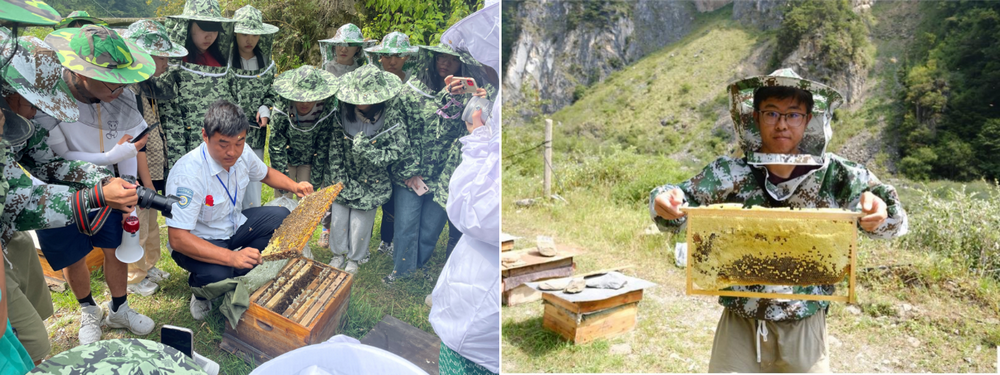 鉴于世界自然遗产地保护对很多当地居民的传统生计方式(如放牧)有一定程度的限制,帮助当地百姓养蜂或者参与研学旅游成为可能的生计选择之一。为了更好地了解养蜂这种当地社区居民的生计方式,营员实地考察卧龙养蜂基地。在邓生沟保护站巡护员何涛老师的带领下,营员们学习了解了中华蜜蜂的特点、蜜蜂的分工与习性、蜂箱的结构。同学们体验了蜂蜜制作全过程,就蜜蜂采蜜时间、养蜂过程中的困难等话题积极提问。这一过程中,营员感受到自然保护地生态系统的魅力,也逐渐认识到养蜂在平衡遗产保护与传统生计维持中的作用。