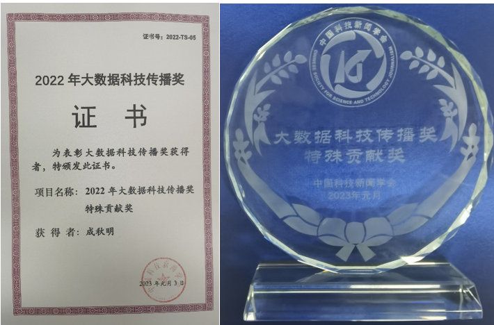 鉴于成秋明院士在我国科技领域、科技成果转换中的杰出贡献,以及在国内外大数据与科技传播领域中的重要影响和作用,受本届评委会审慎推荐和严格评审审定,其获得“2022年大数据科技传播奖特殊贡献奖”。据悉,本次还评审出作品奖9项,团体奖13项,个人奖28名。