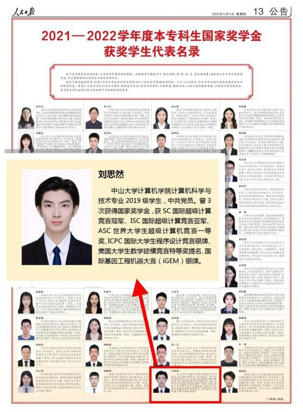 中大新闻网广州5月6日电(通讯员林仪)5月4日,人民日报发布《2021—2022学年度本专科生国家奖学金获奖学生代表名录》(以下简称《名录》),我校刘思然同学名列其中。