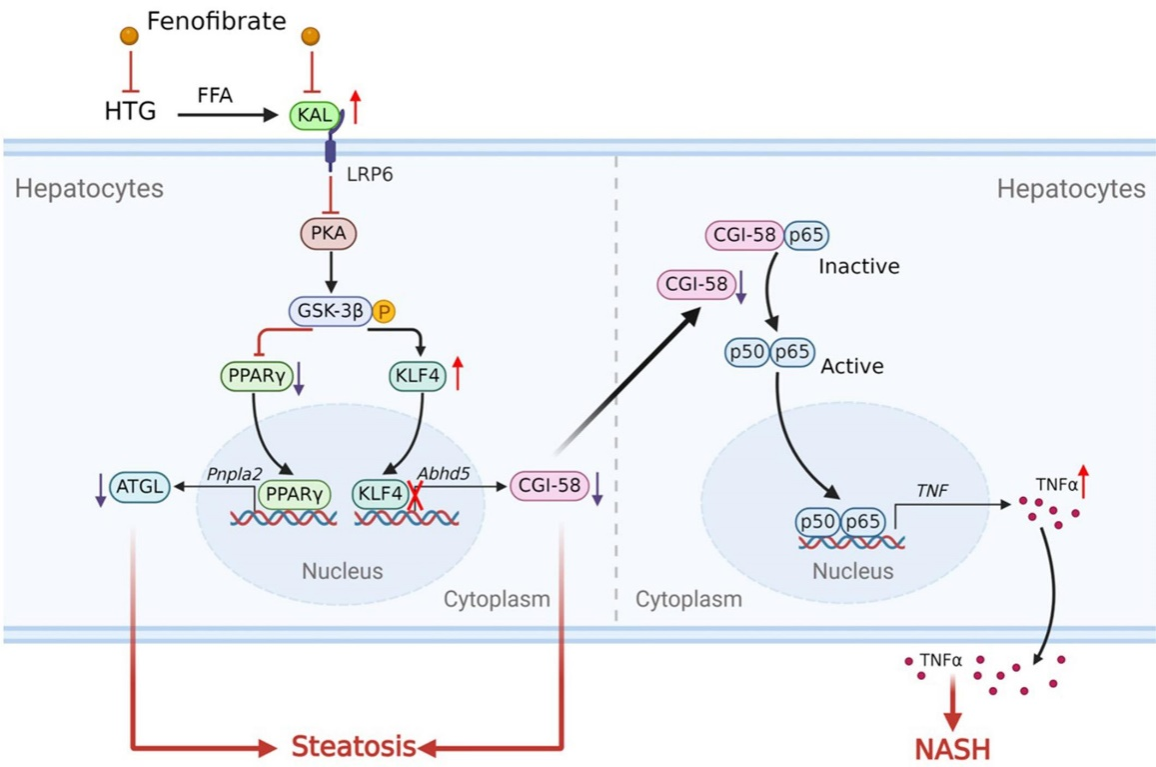2024年3月12日,bat365在线中国登录入口中山医学院高国全、周倜、杨霞教授团队在Signal Transduction and Targeted Therapy上发表了题为“Elevated Kallistatin promotes the occurrence and progression of non-alcoholic fatty liver disease”的研究论文。该研究基于数据库分析、临床样本分析、转基因小鼠模型和转录组学研究等,证明了HTG中异常升高的肝分泌因子KAL通过靶向CGI-58/NF-κB/TNF-α信号通路参与调控NAFLD的发生和发展。该研究明确了介导高脂血症向NAFLD发展的关键调控分子,阐明了KAL通过LRP6/PKA/GSK3β信号通路下调TG水解的关键酶ATGL及其共激活因子CGI-58导致肝脂肪变性,下调的CGI-58通过非ATGL依赖的途径激活NF-κB p65/TNFα炎症通路促进NASH的发生,同时揭示了HTG中KAL上调的机制。这些发现为阻断高脂血症向脂肪变性及NASH进展提供了新思路和新靶点,本研究聚焦中国常见的非肥胖型NAFLD人群,具有较强的临床价值。专职科研人员方珍珍副研究员为论文的第一作者。