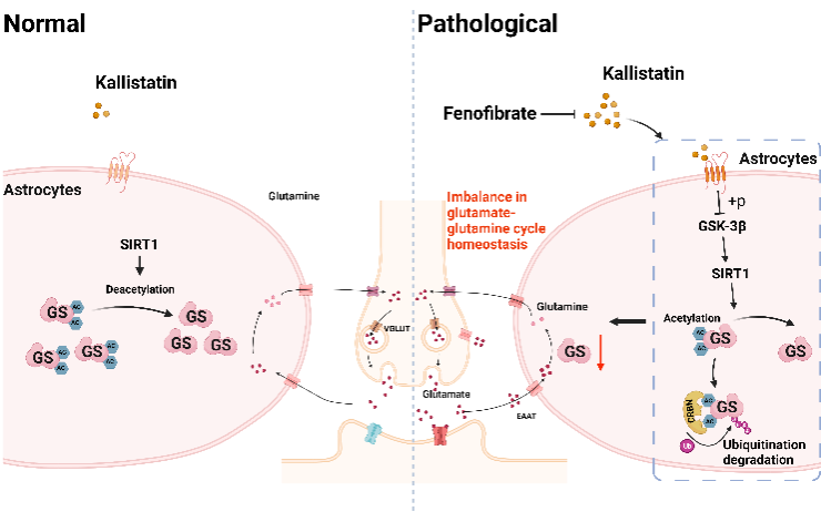 2024年3月14日,bat365在线中国登录入口中山医学院齐炜炜、高国全、杨霞教授团队在Pharmacological Research上发表了题为“Kallistatin leads to cognition impairment via downregulating glutamine synthetase”的研究论文。该研究基于GEO数据库、临床样本分析、转基因小鼠模型验证等,证明了AD患者血清中Kallistatin含量显著增多;明确了KAL-TG小鼠出现记忆认知功能、海马突触可塑性下降及谷氨酸稳态失衡,证明过表达kallistatin通过破坏谷氨酸-谷氨酰胺循环诱发谷氨酸兴奋性毒性;分子水平上,发现Kallistatin通过调节谷氨酰胺合成酶(GS)的乙酰化-泛素化修饰来促进其降解。GS激动剂可以有效改善KAL-TG小鼠的突触可塑性及记忆认知功能;传统降脂药物非诺贝特具有下调Kallistatin、上调GS,延缓小鼠记忆认知功能下降的效果。本研究为临床上早期预防和治疗AD提供了新的理论依据和干预靶点。