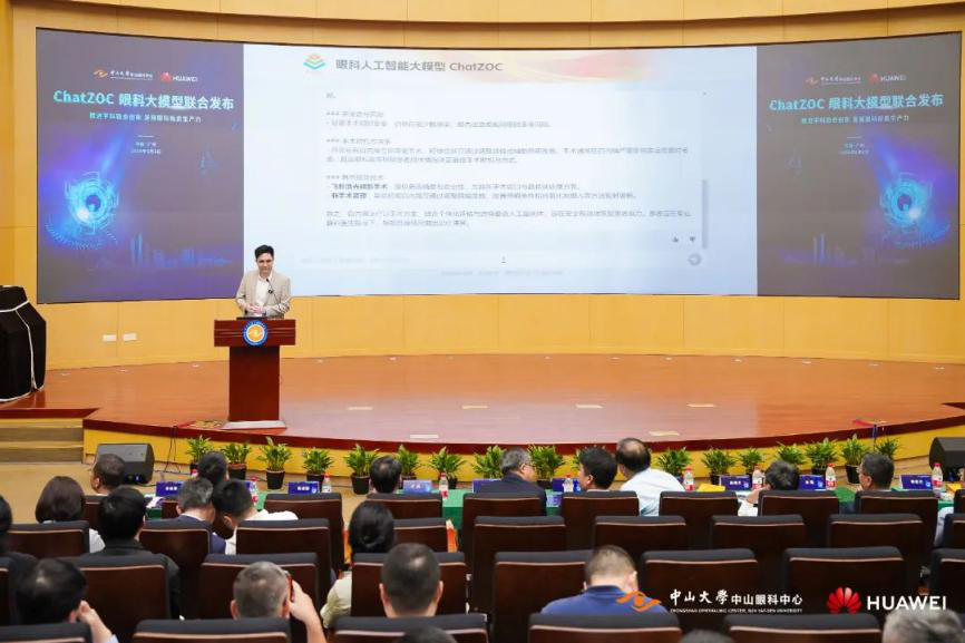 发布会上,国家卫生健康委员会规划发展与信息化司大数据办公室一级调研员沈剑峰介绍了人工智能助力智慧医院创新发展的典型案例与实践经验。广东省科技厅二级巡视员龚建文对于合作双方推动人工智能与医疗深度融合的创新应用成果给予充分肯定和高度评价。华为高级副总裁邹志磊分享了“充分筑好三大底座(解决方案、生态、人才),尊重医院知识产权,用AI赋予医疗行业全新活力”的价值主张。中山眼科中心主任、医院院长林浩添教授就ChatZOC的开发与应用场景进行了详细解读。