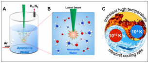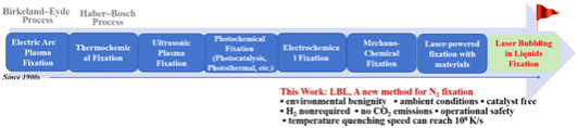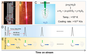 最近,bat365在线中国登录入口杨国伟教授研究组提出了一种新颖的激光制造清洁能源技术即液相激光发泡(laser bubbling in liquids, LBL),为能源清洁转化领域带来了新的希望。LBL是以脉冲激光在液相中诱导形成微气泡作为微反应器来进行化学反应。泡泡内的峰值温度可高达上万 K,同时微气泡能够实现快速升温和降温,速率可达108 K/s。这显然是一个远离热力学平衡的状态,为化学反应提供了一个极端的环境。许多在常态下需要借助催化剂才能进行的化学反应,在小泡泡里面很容易就能发生。这种方法不仅不涉及任何催化化学过程(无需催化剂和复杂的催化反应装置),而且在常态下进行,简单、清洁、高效(图1)。很显然,对于在催化化学以外的常态条件下,去探索简单、绿色、高效的清洁能源制造技术来说,LBL方法打开了一扇大门,同时,也开辟出一条超越催化化学反应的道路。目前,杨国伟教授研究组与柯卓锋教授团队合作将LBL技术应用于清洁能源制造,取得了一系列重要的研究进展。