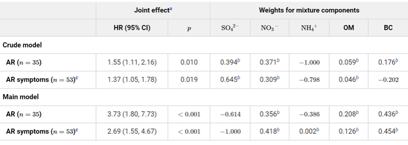该研究追踪调查来自广州越秀出生队列的657名母子对,通过病历诊断和标准化问卷调查收集了幼儿出生至2岁的过敏性鼻炎发生情况。基于2016-2019年期间中国大气成分近实时追踪数据集(Tracking Air Pollution in China,简称TAP)的日均污染物数据,评估了母亲从怀孕至分娩期间的PM2.5及其化学成分的平均暴露浓度,包括硫酸盐(SO42-),硝酸盐(NO3-),铵盐(NH4+),黑碳(BC)和有机物(OM)。采用quantile-based g-computation 模型对PM2.5组分的混合暴露进行联合作用分析,并以权重指数表示各组分的作用方向与相对贡献。研究结果发现PM2.5每升高5 μg/m3与幼儿2岁以内鼻炎及其症状风险分别升高1.85和1.79倍有关;PM2.5的5种组分共同升高一个五分位数水平与鼻炎及其症状风险升高3.73和2.69倍有关。其中,黑碳在单污染物模型和多组分联合暴露中均与幼儿鼻炎结局呈现正相关,是组分联合有害效应的最大贡献者(分别为43.6%和45.4%,见表1)。