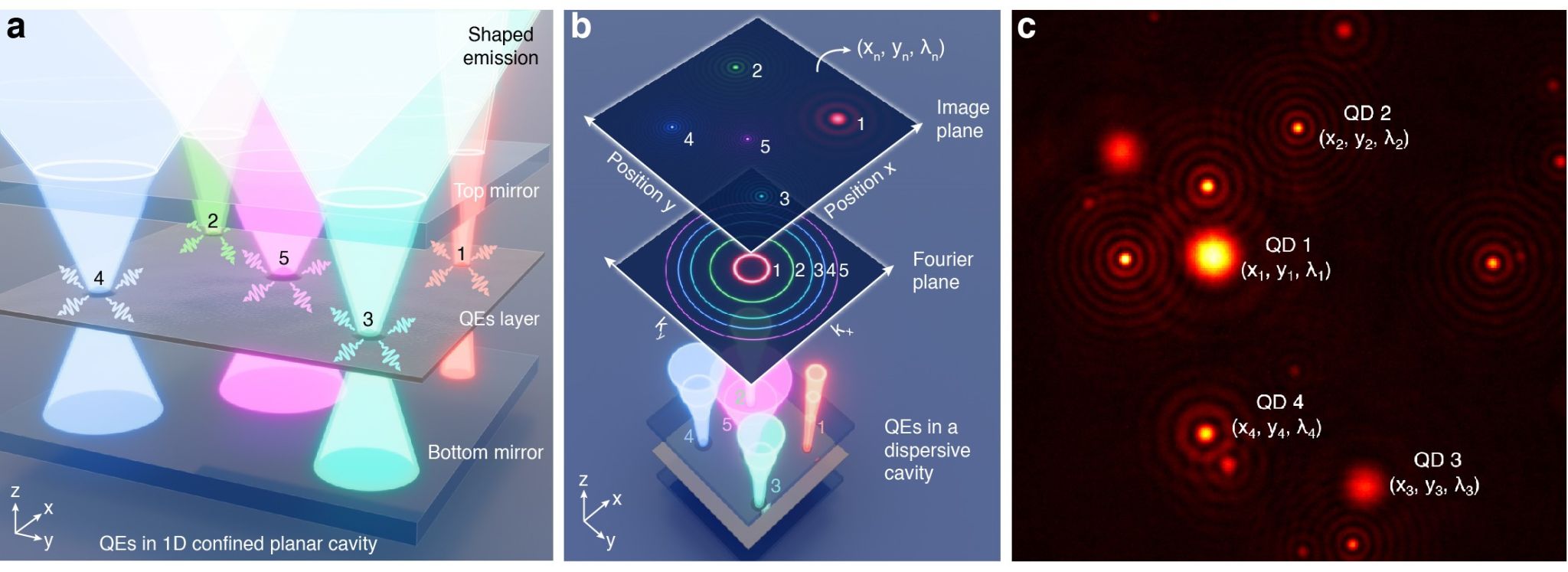 量子辐射子与微纳光子结构的确定性耦合对于探索光与物质的相互作用、制备高性能的光量子器件、构建可扩展的光量子集成芯片等至关重要。然而, 量子辐射子的空间位置与光谱的随机性往往导致其与微纳光子结构模式的失配, 严重阻碍了高性能量子光源的实现及应用。精准确定每个量子辐射子的空间位置和辐射波长是解决这一重大挑战的关键,为此,bat365在线中国登录入口王雪华/刘进教授研究团队,提出和开发了量子辐射子的超分辨和高光谱快照式荧光成像方法与技术,它能同时对大量的量子点进行高精度的空间定位和光谱分辨,并基于该技术实现了高性能微腔量子光源器件的规模化确定性制备。这一技术巧妙利用纳米光子平面微腔的色散关系对量子点远场荧光辐射的调控作用,仅通过单次成像便可同时获取多个量子点的空间位置信息和光谱信息,其空间定位与波长分辨精度分别达到15 nm 和0.4 nm。这项研究突破了传统成像技术只能获取量子点位置信息的限制,解决了量子点与微纳光子结构无法确定性耦合的难题,可为量子辐射子的快速全面表征、光量子功能器件的批量制备、可扩展光量子芯片的研发、超分辨生物成像等提供关键技术支撑,将进一步推动量子信息技术与经典光学成像技术的发展。