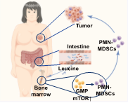 中大新闻网讯(通讯员熊丽娜)全球包括中国人群的高脂肪摄入量和肥胖率正快速上升。目前,高脂饮⻝(HFD)和肥胖已被认为是一些恶性肿瘤的高危因素。高脂饮食可通过破坏肠道菌群平衡导致癌症恶性发展。然而,与HFD相关肠道菌群在癌症进展中的作用仍不清楚。在该论文中,作者们对5031例患者数据的分析发现肥胖和肥胖相关肠道菌群与乳腺癌女性患者的不良预后和晚期临床病理状态相关。为阐明HFD相关肠道菌群在癌症进展中的作用,作者们对高脂饮食条件下的荷瘤小鼠开展了粪菌转移等系列实验,证明失衡的HFD肠道菌群上调了血清中支链氨基酸尤其是亮氨酸的水平,亮氨酸激活了骨髓中髓系祖细胞的mTORC1信号通路,促发多形核髓源性抑制细胞(PMN-MDSCs)的分化,进而促进了癌症发展;进一步发现脱硫弧菌属细菌( Desulfovibrio)在超重/肥胖症患者的粪便中富集,并与肿瘤增长、粪便亮氨酸水平和PMN-MDSCs 水平正相关,无菌动物菌株灌胃实验的结果也验证了上述发现,表明脱硫弧菌是驱动癌症进展的肠道菌群中的关键类群。最后,作者们发现 HFD菌群诱导的外周血亮氨酸水平升高与女性乳腺癌患者肿瘤PMN-MDSC浸润丰富及临床预后差相关。以上结果揭示“肠道-骨髓-肿瘤”轴参与了HFD介导的癌症发展,为靶向调控肠道菌群-宿主共代谢物干预癌症发展提供了新的策略。