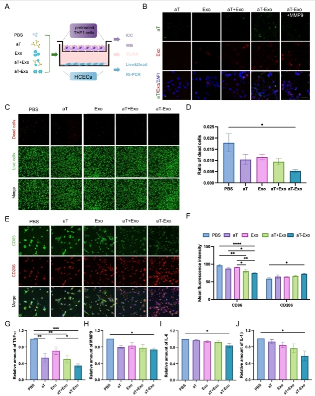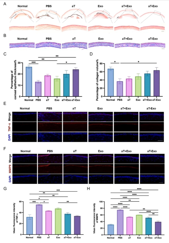 在角膜上皮细胞与M1型巨噬细胞共培养体系中,aT-Exo可以通过促进巨噬细胞M2型极化,显著降低共培养体系中的TNF-α、MMP9、IL-6和IL-1β表达(图3)。