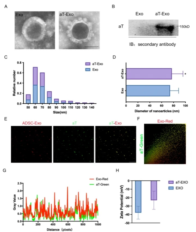 研究团队通过基质金属蛋白酶(MMPs)可切割肽链将抗TNF-α抗体(aT)连接于脂肪间充质干细胞外泌体(ADSC-Exo)表面构建工程化外泌体(aT-Exo),通过电镜、免疫荧光共定位、纳米流式及Zeta电位检测等方法检测aT-Exo的特征(图1)。