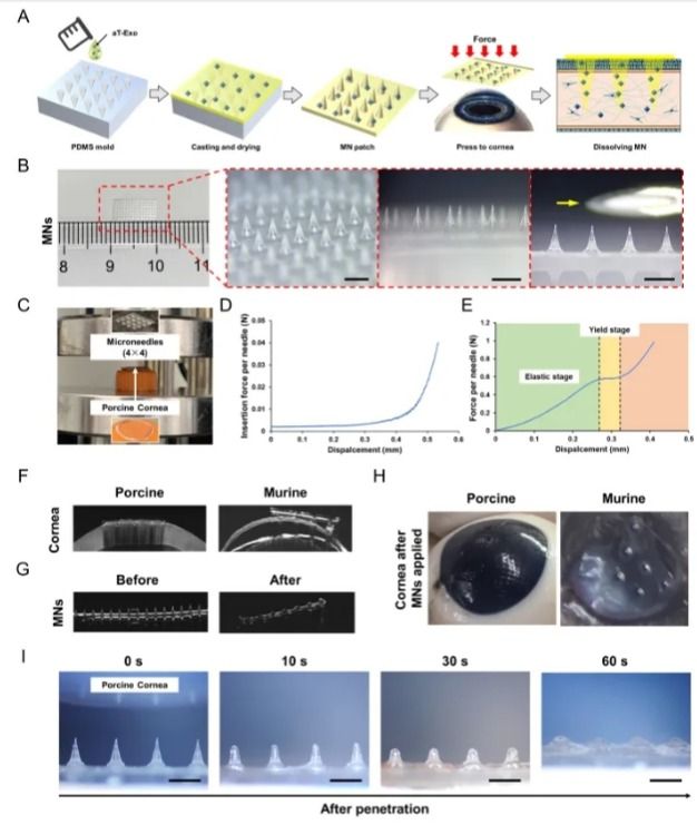 为了克服传统眼局部给药,组织穿透性和生物利用度低的局限性,研究团队采用聚乙烯醇(PVA)构建微针(MNs)阵列,实现工程化外泌体跨角膜上皮递送。显示载外泌体微针具有足够的强度有效穿进角膜基质层,相比于传统给药方式,MNs具有更高的角膜药物利用率和更长的药物释放时间,实现外泌体的靶向递送(图4)。