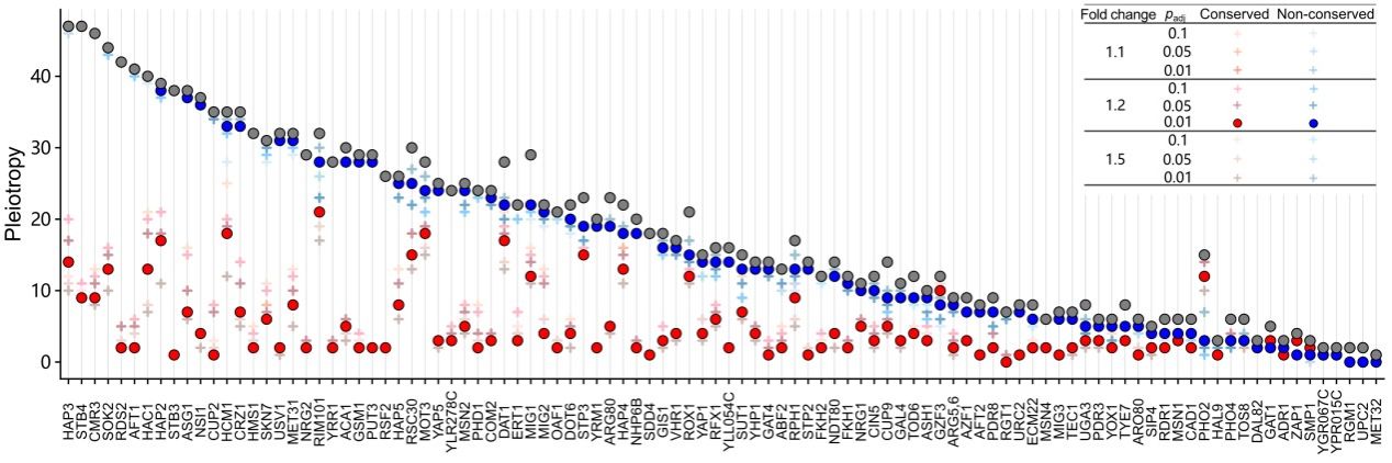 为了验证这一假设,研究人员进一步研究了由两个菌株的约1000个杂交后代组成的群体中遗传变异的多效性效应。他们观察到,新进化的表达数量性状位点(eQTL)比古老的eQTL影响更多基因的表达。这表明自然选择正在逐渐消除适应不良或轻微有害的多效性反应。