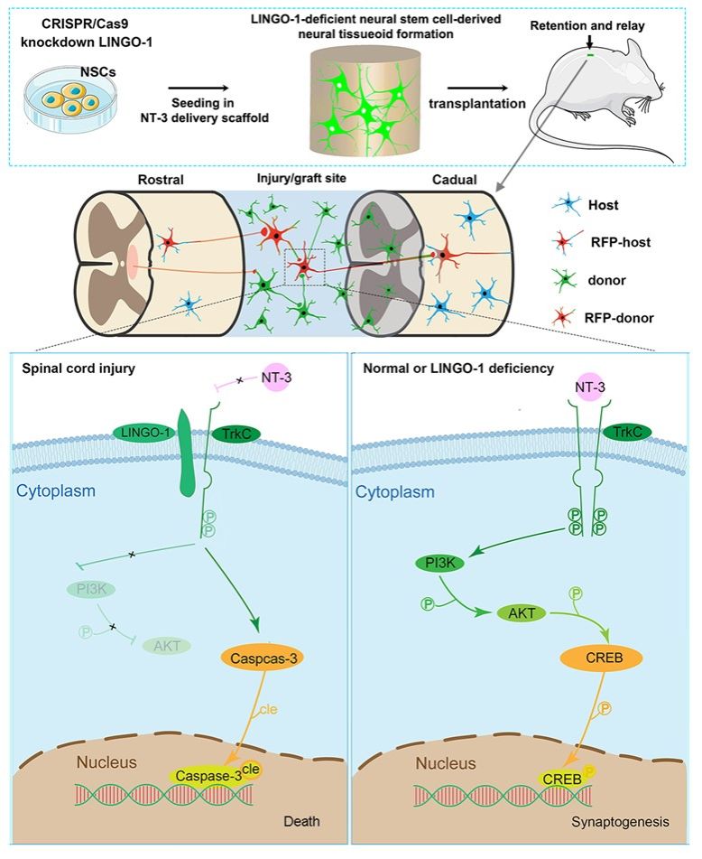 附图: LINGO-1缺失型神经类组织移植在全横断脊髓损伤/移植处重建了中继脑源性神经信息的节段性神经通路。全横断脊髓损伤后,LINGO-1通过增加cle-Capase-3导致细胞死亡,并与TrkC相互作用,降低PI3K/AKT/CREB轴的磷酸化,引起突触降解。CRISPR-Cas9介导的LINGO-1缺失将促进供体神经元TrkC二聚体的形成和磷酸化,并激活下游经典的突触形成信号通路。