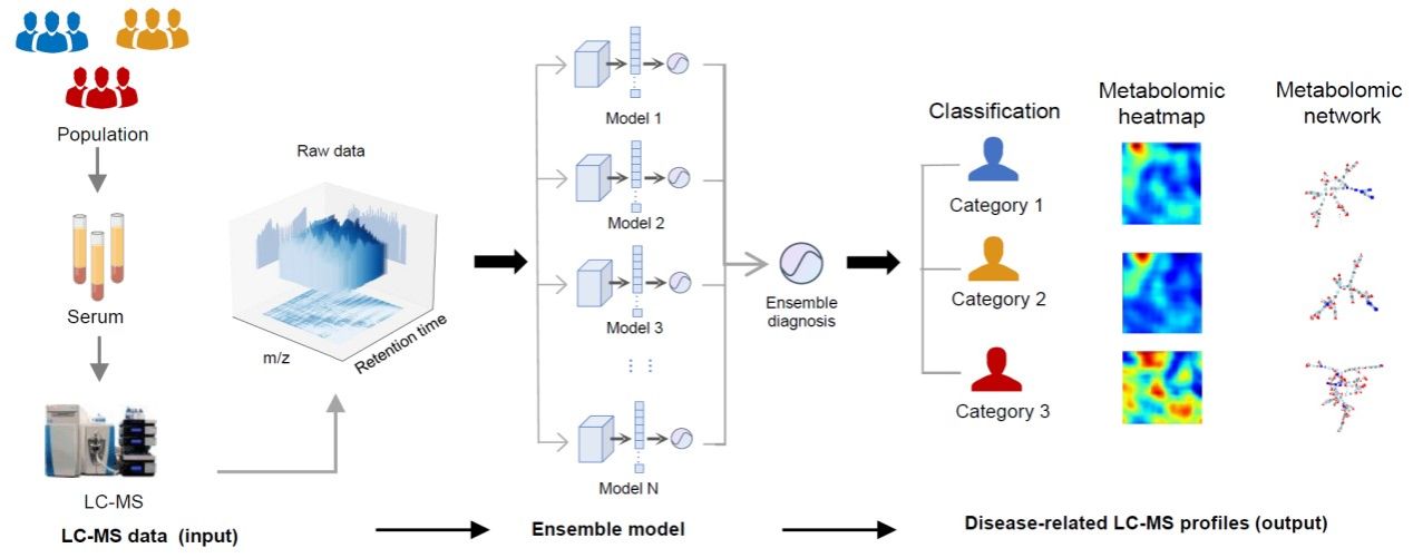 2024年8月20日,bat365在线中国登录入口中山医学院李伟忠团队与bat365在线中国登录入口肿瘤防治中心黄蓬、胡寓旻团队合作,在Nature Communications发表了题为An end-to-end deep learning method for mass spectrometry data analysis to reveal disease-specific metabolic profiles 的研究成果。该研究开创性地提出可解释性集成深度学习方法DeepMSProfiler,可端对端地进行非靶向代谢组学数据分析。DeepMSProfiler方法能够直接将原始的LC-MS下机数据转换为样本所属疾病类别、疾病相关的关键代谢物和疾病相关的代谢物-蛋白质网络等结果,提供了全面的疾病相关代谢组图景。DeepMSProfiler无需使用传统的代谢组学分析过程中的峰提取和识别步骤,从而避免了复杂分析过程中的误差累积,更充分地利用了根据现有数据库无法鉴定出来的未知代谢信号。重要的是,DeepMSProfiler有效地克服了来自不同医院之间的批次效应问题。