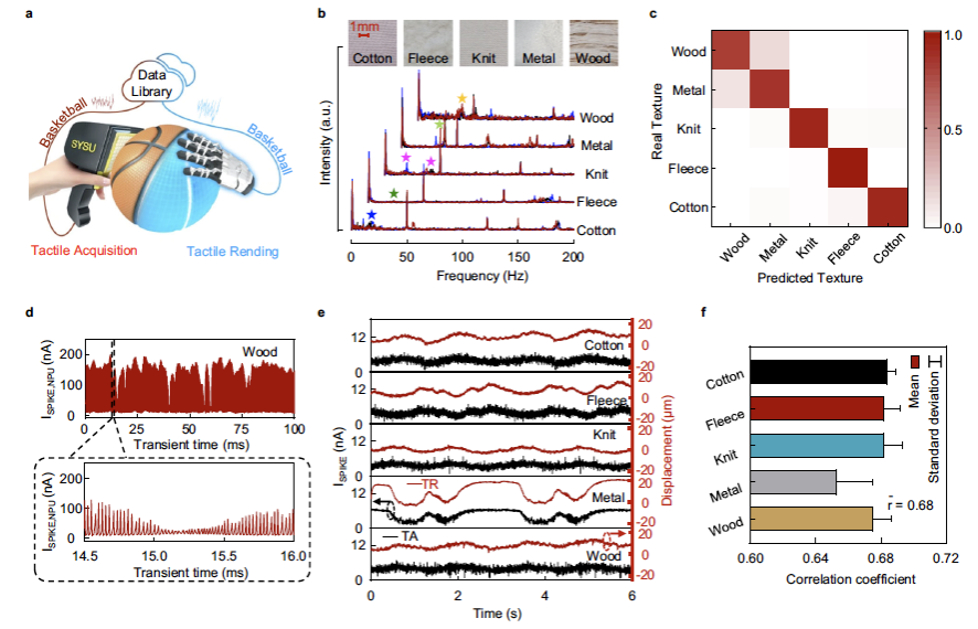 课题组利用制备的10×10神经形态触觉传感器阵列捕捉5种不同类型材质表面纹理的神经形态触觉信息(TA),见图3。不同类型材质的TA信号频谱存在不同的特征峰,其采用人工神经网络(ANN)计算的识别率高达93%,表明神经形态触觉传感器阵列可采集高质量材质表面特征信息。将这些触觉信息编码产生驱动执行器表面的触觉渲染信息(TR),尝试再现皮肤在虚拟空间重现材质表面“真实”的触觉。该传感器阵列采集的神经形态触觉信号(TA)与重现的触觉渲染信号(TR)相关性高达0.68;而在进一步的物理感知心理学实验中,超过75%的志愿者表示能够通过重现的触觉渲染信息可以感知物体表面的粗糙度,初步证明该触觉传感器具备实现触觉的采集-重现闭环功能的潜力。所提出的神经形态触觉传感器,凭借其低成本、低功耗、易于集成和制备等特点,为实现大规模人工触觉感知系统奠定了坚实的理论和实验基础。