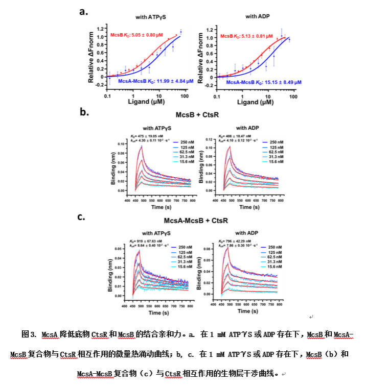 此外,结构信息显示McsA的结合位点接近McsB的底物结合口袋,表明McsA可能会干扰McsB和底物CtsR之间的相互作用。研究者通过微量热涌动(Microscale Thermophoresis,MST)和生物层干涉(Bio-Layer Interferometry,BLI)等实验表明,McsA的结合会降低McsB对CtsR的结合亲和力。重要的是,这种亲和力的降低主要体现在解离速率的增加,表明了McsA的结合加速了磷酸化CtsR的离去速率从而加快了反应循环。