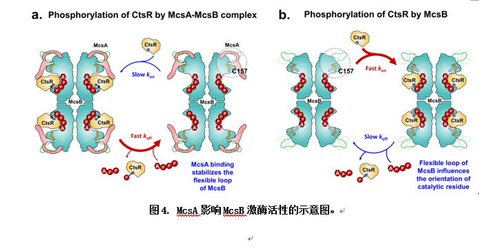此项工作首次解析了激酶复合物McsA-McsB的冷冻电镜结构,揭示了McsA通过锌指结构域及α螺旋与McsB结合,稳定了McsB的关键催化半胱氨酸残基C157并显著降低了底物蛋白CtsR与McsB的结合能力,加速磷酸化CtsR的离去速率,从而增强McsB的精氨酸激酶活性,实现对CtsR的磷酸化修饰。这种磷酸化修饰通过McsA激活McsB后对CtsR的精准调控,使得CtsR的抑制作用得以解除,从而迅速响应环境变化,有效维持了细胞内蛋白质的质量和功能稳定。