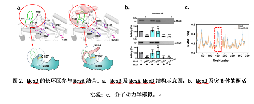 观察McsB与McsA的相互作用面可知,McsB通过一段长环区与McsA的锌指结构域和两个α螺旋完成相互作用。在单独的McsB中,McsB长环区主要通过两个酪氨酸残基Y147和Y153形成典型的T型π-π堆积,以保持稳定。值得注意的是,催化残基之一的C157位于同一环区。若破坏该π-π堆积,则会扰乱催化残基C157的朝向,最终导致McsB完全丧失激酶活性。由于McsB长环区的构象对其激酶活性的关键作用,研究者推测McsA结合可能会稳定该环区,从而固定催化残基C157的朝向,进而加强McsB对CtsR的磷酸化修饰活性。为了验证假设,研究者对McsB和McsA-McsB复合物结构进行了分子动力学(Molecular Dynamics,MD)模拟。RMSF分析表明,与McsA-McsB复合物结构相比,McsB的一个区域(残基I145-G164)的柔性大大增强。这一柔性区域包括McsB长环区域(残基Y147-L154)和关键的催化残基(Cys157)。这些发现揭示了McsA在稳定和限制McsB长环区和保守催化Cys残基的动态行为中的关键作用。