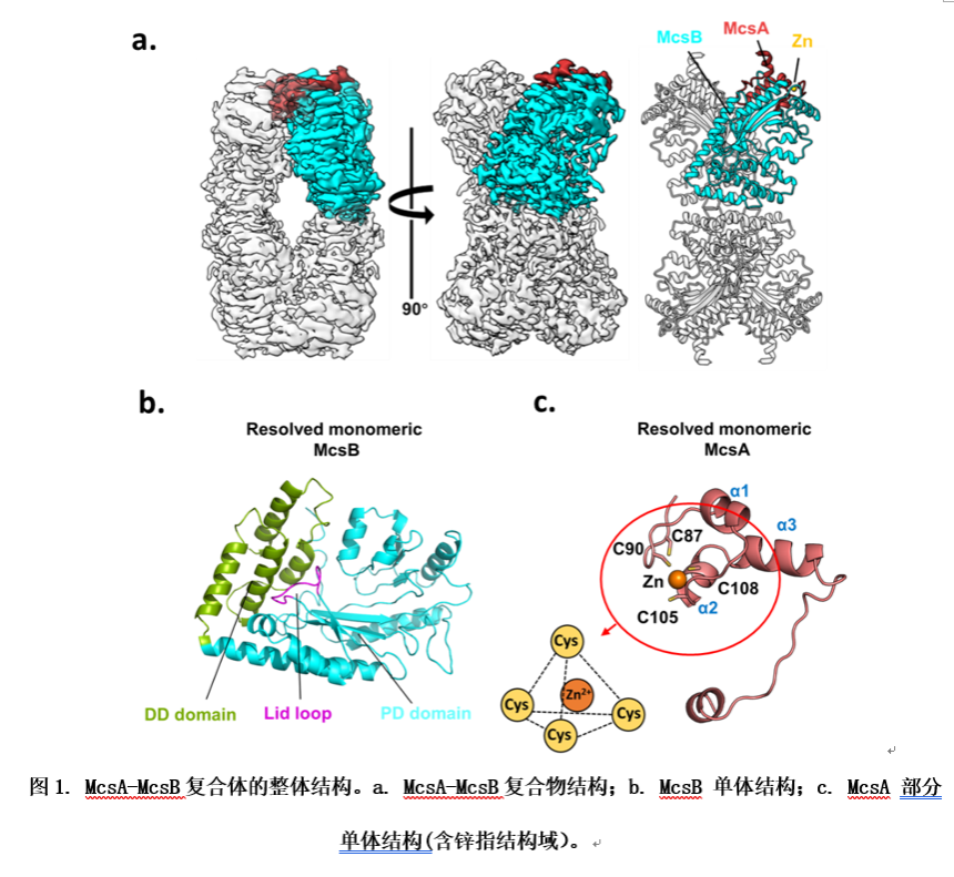 中大新闻网讯(通讯员夏炜)蛋白质的磷酸化是一种由激酶和磷酸酶介导的可逆蛋白质翻译后修饰(Protein translational modification, PTM)过程。这一动态修饰过程在新陈代谢、转录、分化以及细胞间通讯等细胞生命的几乎所有方面都发挥着重要作用。蛋白激酶在这种调控机制中扮演着核心角色,它们催化ATP的γ-磷酸向蛋白质底物的氨基酸侧链转移,从而实现关键的磷酸化过程。在众多蛋白激酶当中,McsB是革兰氏阳性菌中目前已知的唯一一种精氨酸磷酸化激酶。其主要参与了细菌蛋白质功能和稳定性的动态调控。在热应激条件下,McsB与激活蛋白McsA结合后能够有效磷酸化热休克转录调节因子CtsR,CtsR的磷酸化修饰是解除其对clpC启动子转录抑制的关键步骤,这一修饰激活了蛋白质质量控制系统核心组件的转录和表达,从而降解细菌中因热应激产生的变性蛋白质。在这一过程中,金属蛋白McsA能够结合McsB,增强其激酶活性,这一事实已经被广泛报道,但有关McsA-McsB复合物的结构基础以及McsA如何激活McsB使底物CtsR发生磷酸化动态修饰的分子机制仍然未知。解析McsA激活McsB的分子机制,有助于深入研究细菌在热压力下如何利用磷酸化动态修饰维持蛋白质稳态,并基于此开发针对性的干预药物,将为抗菌治疗提供新的思路和理论依据。