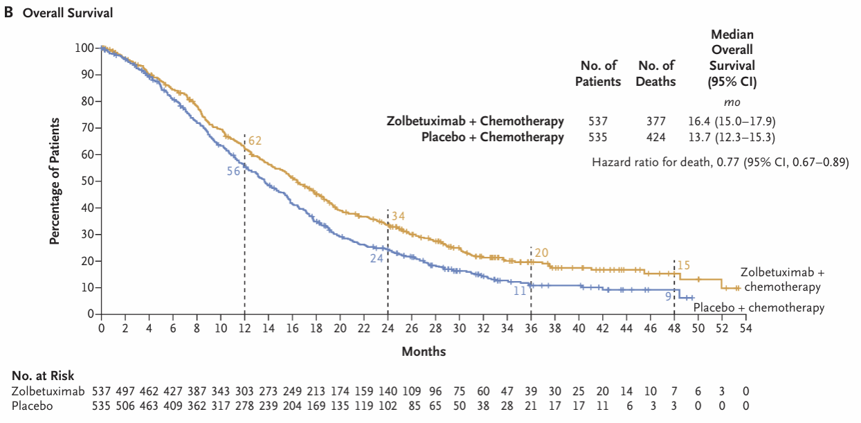 SPOTLIGHT和GLOW研究的汇总分析显示,佐妥昔单抗联合化疗相比安慰剂联合化疗,显著延长了HER2阴性CLDN18.2阳性晚期胃癌患者的无进展生存期和总生存期。治疗组和安慰剂组的中位PFS分别为9.2个月和8.2个月,疾病进展风险降低了29%(HR=0.71;95% CI, 0.61-0.83),达到了主要终点。在关键次要终点方面,佐妥昔单抗联合化疗显著延长了OS,治疗组和安慰剂组的中位总生存期分别为16.4个月和13.7个月,死亡风险降低了23%(HR=0.77;95% CI,0.67-0.89),2年生存率治疗组是对照的2倍。接受佐妥昔单抗治疗的患者中最常见的不良事件是恶心和呕吐,此次汇总分析未观察到新的安全信号。