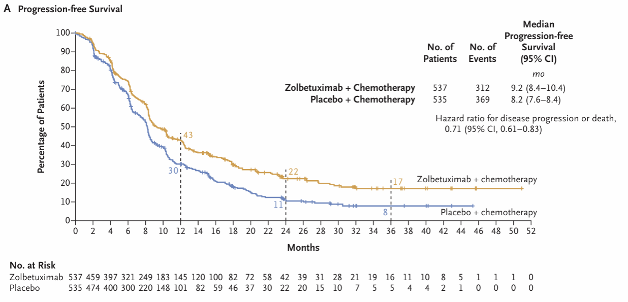 SPOTLIGHT和GLOW研究都是全球性、多中心、随机、双盲、安慰剂对照的III期临床研究,共纳入了1072例CLDN18.2阳性、HER2阴性的局部晚期不可切除或转移性胃癌或胃食管结合部腺癌患者。患者随机接受佐妥昔单抗联合化疗或安慰剂联合化疗,其中SPOTLIGHT研究中的化疗方案是mFOLFOX6,GLOW研究中的化疗方案是CAPOX。主要研究终点为无进展生存期(PFS),关键次要研究终点是总生存期(OS),其他次要研究终点包括客观缓解率(ORR)、缓解持续时间(DoR)和安全性等。