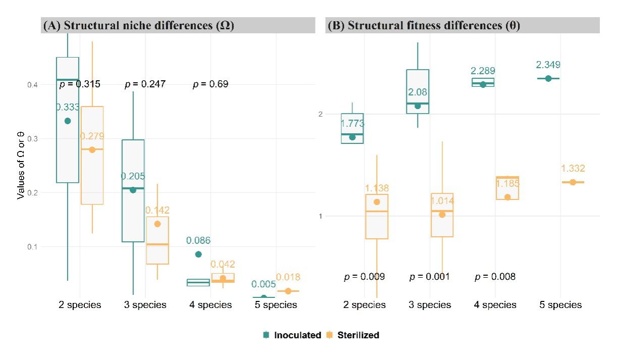 在获得内禀增长率和相互作用系数矩阵后,利用结构化共存方法估算了两物种至五物种群落的结构化生态位差异(Ω)和结构化适合度差异(θ),以评估土壤微生物对多物种共存的影响。结果显示(图2),土壤微生物显著影响多物种群落的结构化适合度差异,而对结构化生态位差异的影响较弱。具体而言,土壤微生物显著增加了所有植物群落的结构化适合度差异。例如,在两物种群落中,土壤微生物使群落的平均结构化适合度差异增加了55.8%;在五物种群落中,这一增幅达到了76.4%。