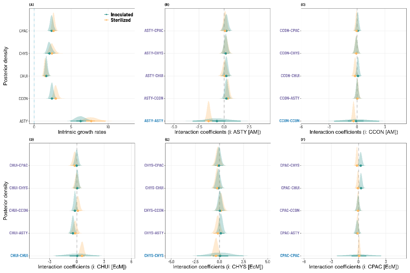 图1 使用贝叶斯建模估算的内禀增长率(λ)和相互作用系数的后验分布。y轴蓝色刻度为种内相互作用系数,紫色刻度为种间相互作用系数。