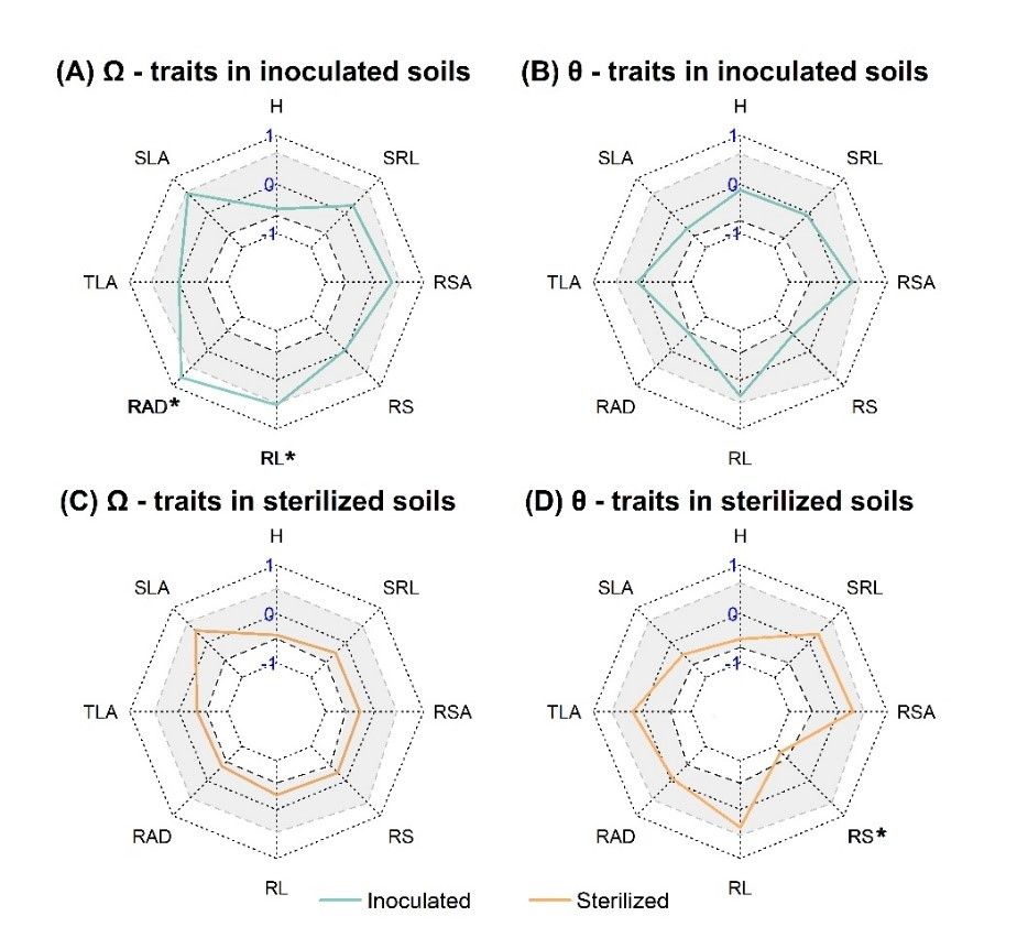 图3 配对物种的性状差异与结构化生态位差异(Ω)和适合度差异(θ)的相关性雷达图,显著相关性以粗体标注(显著性水平为0.05)。(A) Ω与接种处理组的性状;(B) θ与接种处理组的性状;(C) Ω与灭菌处理组的性状;(D) θ与灭菌处理组的性状。
