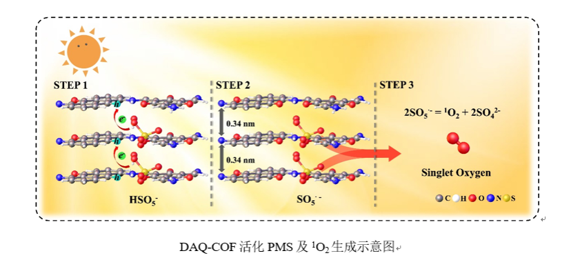 基于上述问题,bat365在线中国登录入口王俊慧副教授和欧阳钢锋教授团队报道了一种全新的1O2的生成策略,通过具有层间协同作用的框架结构有效拉近SO5·-的反应距离,从而实现高达14.8 μM s−1的1O2产生速率。实验和理论计算表明所合成的新型层状共价有机框架光催化剂(DAQ-COF)具有丰富的活性位点(C=O基团),DAQ-COF中的C=O基团是活化PMS的催化中心。激发态下空穴主要集中在C=O基团上,而PMS作为电子给体向空穴提供电子,从而形成SO5·-。随后由于层间协同的相互作用,两个SO5·-在距离较近的层间产生(小于0.34 nm),进而迅速结合产生1O2,这与报道的具有远距离活性位点的催化剂有很大的不同。这种层间协同的概念是提高超短寿命自由基利用效率的一种创新而有效的策略,可以为绿色能源、化学合成、环境技术等各个领域提供新的思路。