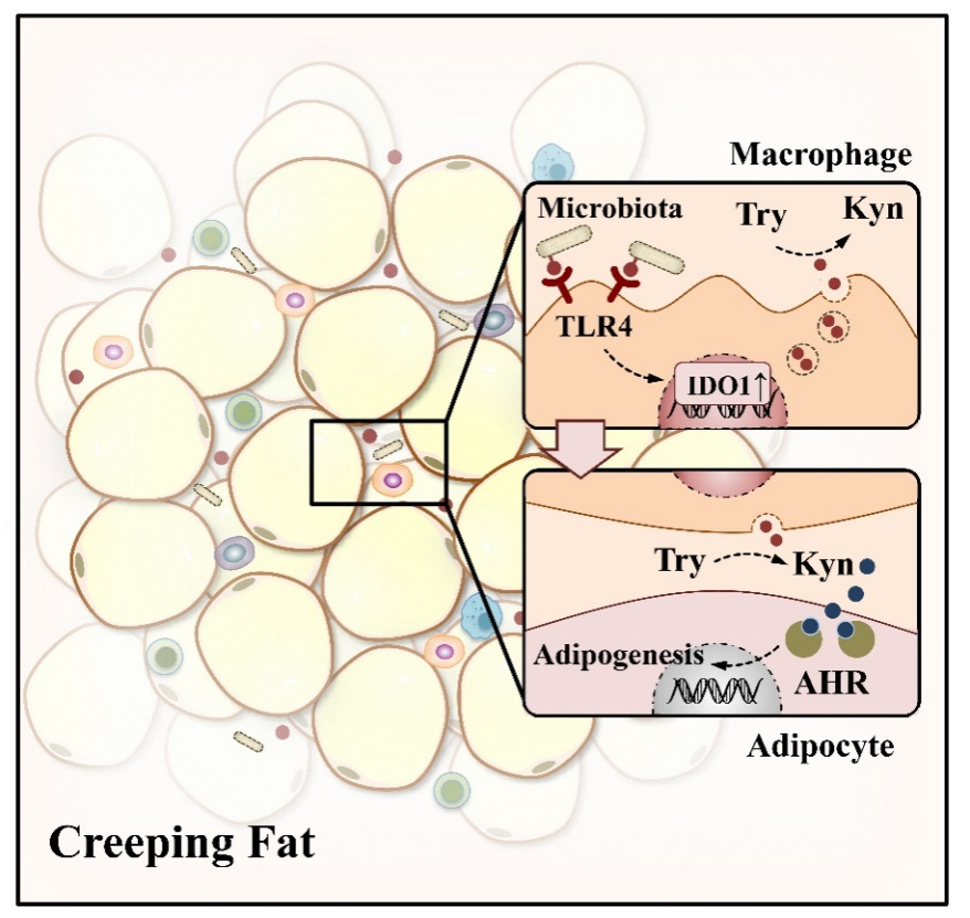 通过靶向代谢组学测序分析,团队发现L-犬尿氨酸是在CrF中最丰富的代谢物。犬尿氨酸是色氨酸的下游代谢产物,其中吲哚胺-吡咯 2,3-二加氧酶 1(IDO1)是色氨酸代谢转化为犬尿氨酸的关键限速酶之一。结合小鼠肠系膜组织单细胞测序和巨噬细胞特异性IDO1敲除小鼠模型,证实巨噬细胞中IDO1的上调增强了犬尿氨酸的产生并驱动肠系膜脂肪生成。