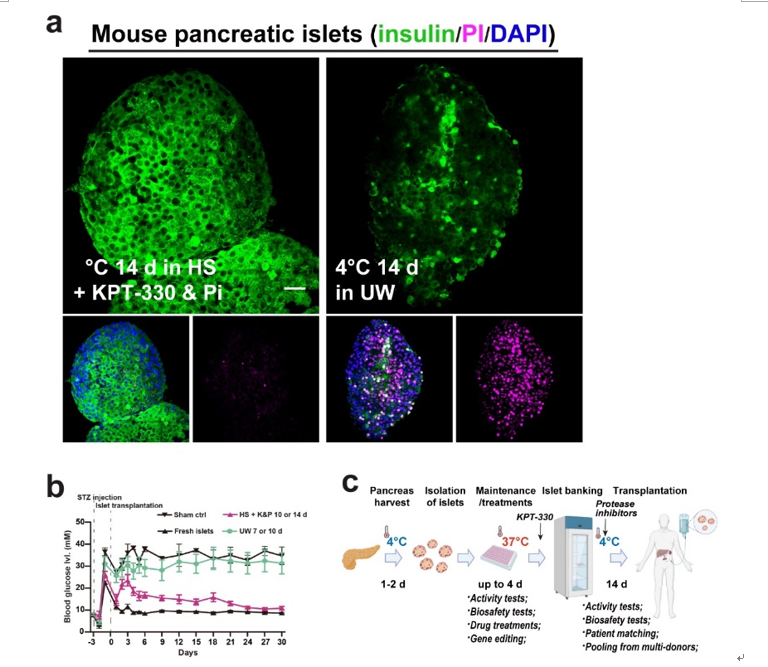 a)本研究提供的胰岛冷保存方案可大幅延长小鼠胰岛冷保存时间至14天,同时减少胰岛细胞的应激死亡;b)胰岛移植实验证实经本研究胰岛冷保存方案保存10-14天后的小鼠胰岛在移植至I型糖尿病小鼠中,可有效下调小鼠血糖;c)关于未来构建捐献者胰腺和胰岛冷保存库以供应胰岛移植的设想。