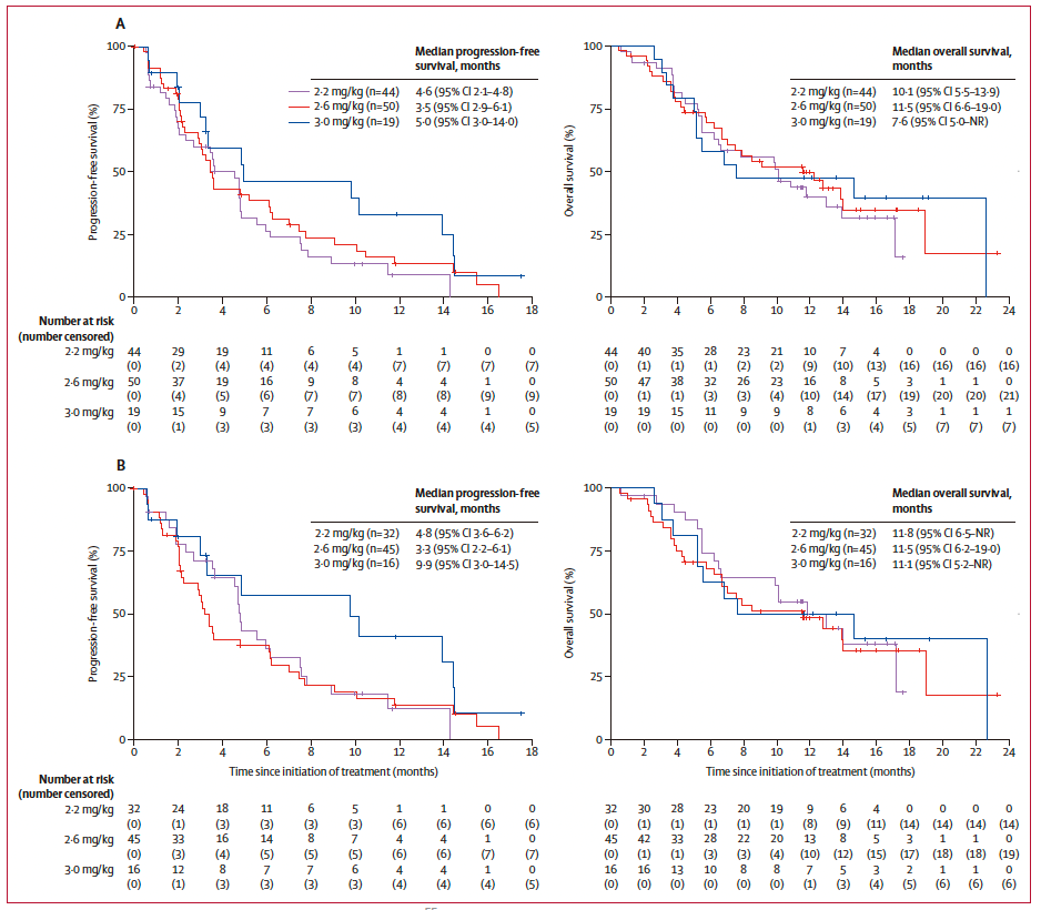 2020年12月24日至2023年2月23日期间,研究共纳入27例晚期实体瘤患者(其中13例为胃癌/胃食管结合部腺癌,14例为胰腺癌)进行剂量递增阶段的研究,以及107名晚期胃癌或胃食管连接部癌患者进行剂量扩展阶段的研究,这些患者均为多线标准治疗后失败的患者。研究分析了2.2 mg/kg、2.6 mg/kg和3.0 mg/kg三个剂量组胃癌/胃食管结合部腺癌患者的疗效数据,在109例病灶可评价患者中,客观缓解率(ORR)为29%,经确认的疾病控制率(DCR)为65%。其中,89例Claudin 18.2高表达(定义为≥20%肿瘤细胞中Claudin 18.2染色强度≥2+)的患者,经确认的ORR为35%,经确认的DCR为70%。所有Claudin 18.2高表达患者中,中位无进展生存期(PFS)为4.8个月,中位总生存期(OS)为11.8个月。研究最终确定CMG901的推荐剂量为2.2 mg/kg,为后续III期研究的开展提供了支持,提示CMG901有望在未来成为Claudin 18.2高表达胃癌/胃食管结合部腺癌患者的治疗新选择。