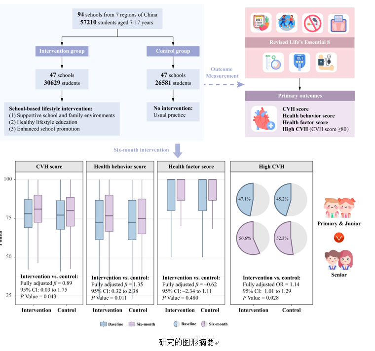研究纳入了我国七个地区94所学校5.7万余名7~17岁的中小学生(其中干预组30629人,对照组26581人)。干预组实施为期6个月的生活方式干预,对照组保持常规状态。干预措施由三部分组成:(1)支持性的学校和家庭环境,包括成立学校监督委员会以及给家长发放干预手册;(2)通过结构化课程、海报、活动和家长会进行健康生活方式教育;(3)加强学校推广,包括设置必修体育课时以及自我监测饮食摄入和体育锻炼情况。在干预前后,基于LE8的评分方法,采用4个健康行为(饮食、体育活动、尼古丁暴露和体质指数)和3个健康因素(血脂、血糖和血压)指标评估儿童青少年的心血管健康状况,计算总体心血管健康得分、健康行为得分、健康因素得分。采用广义线性混合模型分析干预效果。