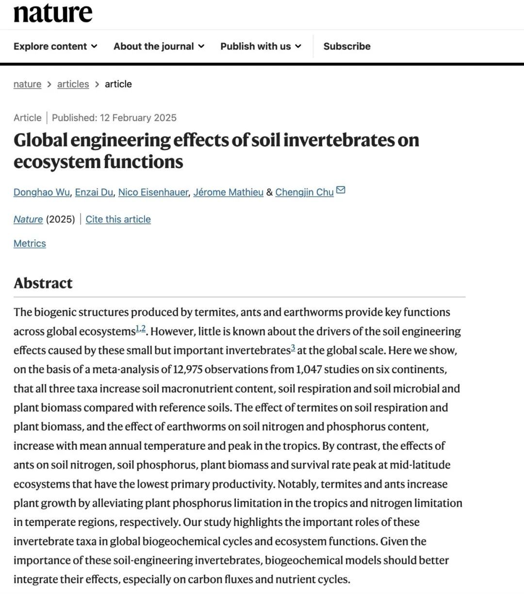 中大新闻网讯 2月12日,bat365在线中国登录入口生态学院储诚进教授团队在《自然》(Nature)杂志发表论文,研究显示,白蚁、蚂蚁和蚯蚓等土壤无脊椎动物具有提升土壤肥力、改善土壤质地和促进作物产量的生态系统功能,对促进全球元素循环、物质降解和生物多样性维持具有重要作用。这一研究为应对气候变暖和促进生态修复提供了全新思路。