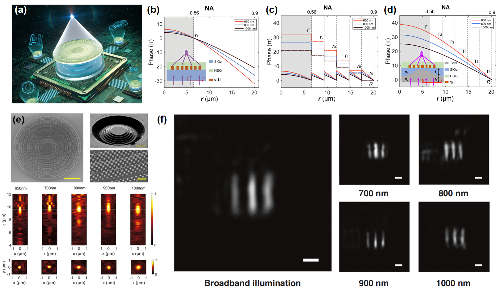 为此,王雪华研究团队提出一种全新的超构原子区分复用方法:利用台阶相位色散补偿层将平面透镜分成传播相位阶梯变化的不同区域,从而实现超构原子相位色散有限调控的区分复用。原理上,这种复用可以不断重复下去,从根本上解决了消色差平面透镜固有的“高大宽”不可兼得的长期困境。该研究为消色差平面透镜在光子集成芯片,生物医学成像、人工智能、自动驾驶、机器视觉等新兴领域的广泛应用扫清了障碍。