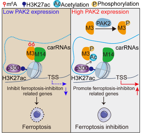 2025年3月17日,中山医学院王金凯教授课题组在《Molecular Cell》上发表了题为“Spatial control of m6A deposition on enhancer and promoter RNAs through co-acetylation of METTL3 and H3K27 on chromatin”的研究论文。该工作发现p300主要在H3K27ac染色质上催化METTL3乙酰化,从而抑制METTL3与METTL14的结合使METTL3脱离H3K27ac染色质,因此特异性地降低增强子RNA(eRNA)和启动子RNA(paRNA)的m6A修饰水平促进铁死亡抑制基因的表达。在肿瘤细胞中高表达的激酶PAK2能够通过磷酸化METTL3而促进METTL3的乙酰化,从而抑制肿瘤细胞铁死亡的发生(如图)。