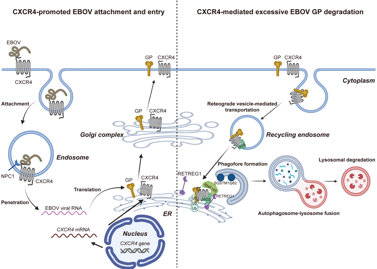 扎伊尔型埃博拉病毒感染引起的埃博拉病毒病(EVD)是一种烈性、出血性传染病。极高的传染性和致死率使EVD成为非洲地区乃至全球的重大公共卫生安全威胁。截至目前,尚无任何有效的抗病毒治疗手段可以治愈EVD。据课题负责人介绍,一方面CXCR4可以通过与EBOV GP互作并促进EBOV进入靶细胞;另一方面CXCR4可以通过促进EBOV GP蛋白通过内质网自噬途径降解,从而降低其细胞毒性,进而增强EBOV的适应性。