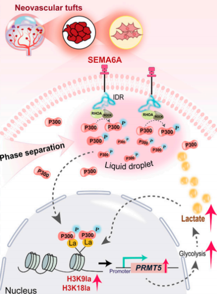 韦艳宏团队长期致力于环境污染物的心血管毒性研究。团队采用前期建立的应激诱导血管病变模型,发现膜受体Sema6A基于疏水相互作用的相态转变起始分子事件,并解析其固有无序区结构特征及其捕获表观遗传调控因子P300的空间隔离效应;通过联合核乳酸化修饰组学、CUT&Tag技术及单细胞分析策略,识别出组蛋白乳酸化调控位点H3K9、H3K18和糖酵解代谢关键调控蛋白Prmt5,阐明驱动血管损伤表型的乳酸平衡紊乱在亚细胞区室间的扰动状态及转录调控方式,构建膜分子相态介导的乳酸化修饰异常、甲基转移酶系功能紊乱与糖代谢网络失衡的正反馈环路。