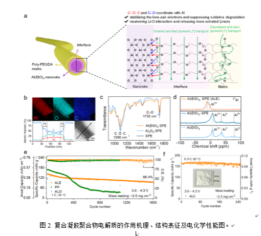 锂金属电池因能量密度高被视为下一代储能技术的核心,但其商业化长期受困于电极界面副反应加剧及锂枝晶生长失控等问题。研究团队基于在铝基纳米材料领域的深厚积累(Science, 2017, 355, 267)(图1),创新性地利用乙醇铝(Al(EtO)3)纳米线的独特配位活性,设计出分子结构工程策略。通过Al(EtO)3与聚乙二醇二丙烯酸酯(poly-PEGDA)定向配位,成功构建出连续稳定的Al(EtO)3–poly-PEGDA界面结构,不仅形成锂离子迁移的快速通道,还将电解质的氧化稳定性提升至5 V以上。同时,锂负极表面原位生成的铝基固态电解质膜兼具良好的机械强度和离子导电性,显著抑制锂枝晶生长。基于该技术的锂金属电池在4.5 V电压下展现出优异的循环性能(图2)。相关成果于2025年5月2日发表于《德国应用化学》。