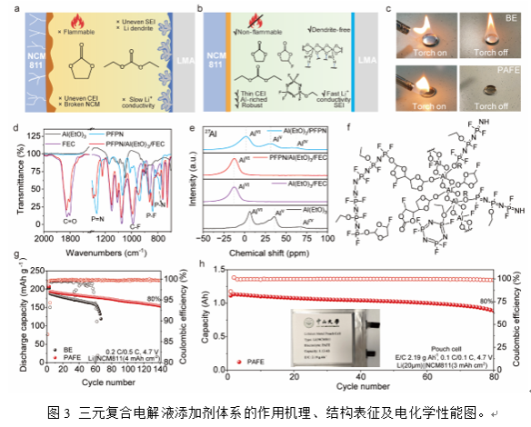 为了进一步提升锂金属电池的能量密度和安全性,团队利用分子结构工程策略,构建三元复合电解液添加剂体系:通过Al(EtO)3与氟代碳酸乙烯酯和乙氧基五氟环三磷腈分子的协同配位,在电极表面原位聚合形成均匀的固态电解质界面,同步缓解三元正极晶格应力并抑制负极枝晶,提升了锂金属电池在4.7 V电压下的循环稳定性和安全性(图3)。该突破性进展发表于2025年5月10日《国家科学评论》。