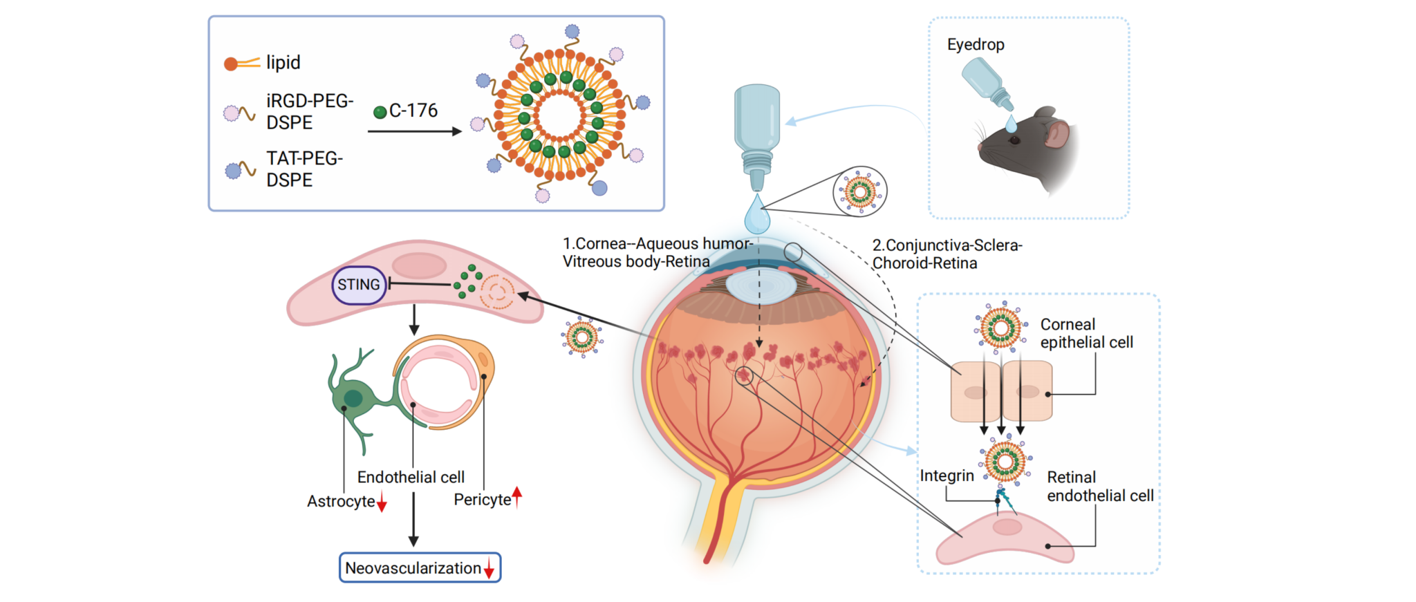 视网膜血管新生是增殖期糖尿病视网膜病变的特征性病理改变,是失明致盲的首要原因。然而,目前的治疗手段十分有限,最常用的方法:激光光凝术和玻璃体内注射抗血管内皮生长因子药物等。但这些治疗方法是有创、费用高,且需要经验丰富的眼科医生操作,并伴随多种不良反应,如眼底出血、视力下降等。因此,迫切需要探索无创性新治疗方法。