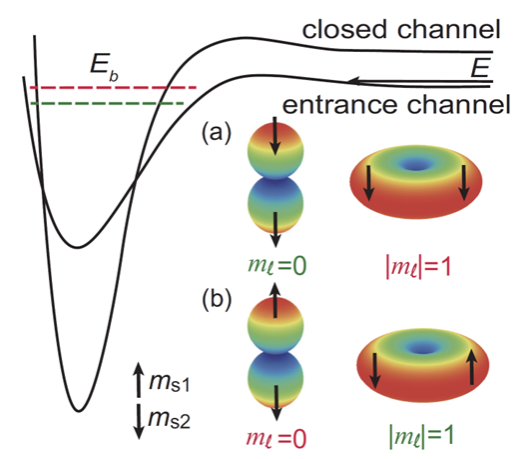 图1:p波轨道中自旋依赖的偶极-偶极相互作用示意图。(a) 自旋极化体系中, |ml|=1呈排斥势。(b) 自旋混合体系中,|ml|=1呈吸引势,导致能级反转。
