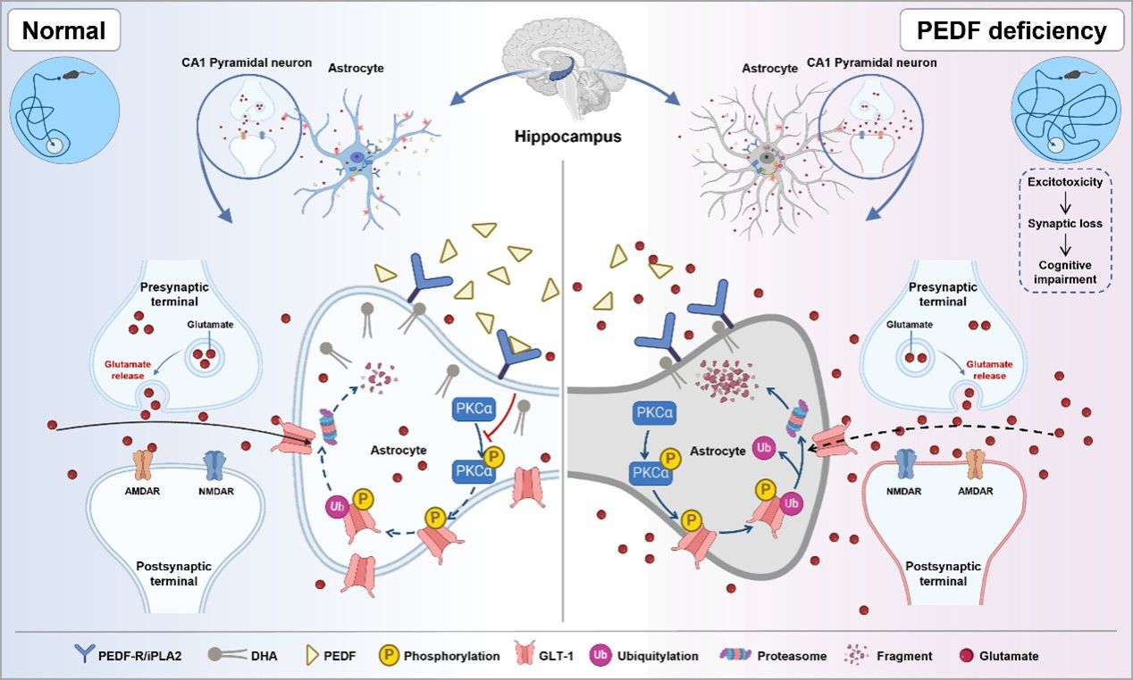研究通过对 19 名 AD 患者和 75 名非痴呆对照受试者的外周血样本进行分析,结果显示患者体内 PEDF 水平较低,且 PEDF 缺失与认知能力下降相关。PEDF 缺乏的小鼠表现出学习和记忆缺陷,并且更容易患 AD。此外,PEDF 缺乏还会损害突触可塑性和树突棘形态。从机制上讲,PEDF 抑制泛素-蛋白酶体依赖的星形胶质细胞谷氨酸转运体-1 (GLT-1) 降解,并通过调节蛋白激酶 C 信号通路正常地保证突触谷氨酸的清除。令人惊讶的是,恢复 PEDF 可挽救 AD 小鼠模型的认知缺陷,而上调 GLT-1 可挽救 PEDF 缺陷小鼠的认知障碍。