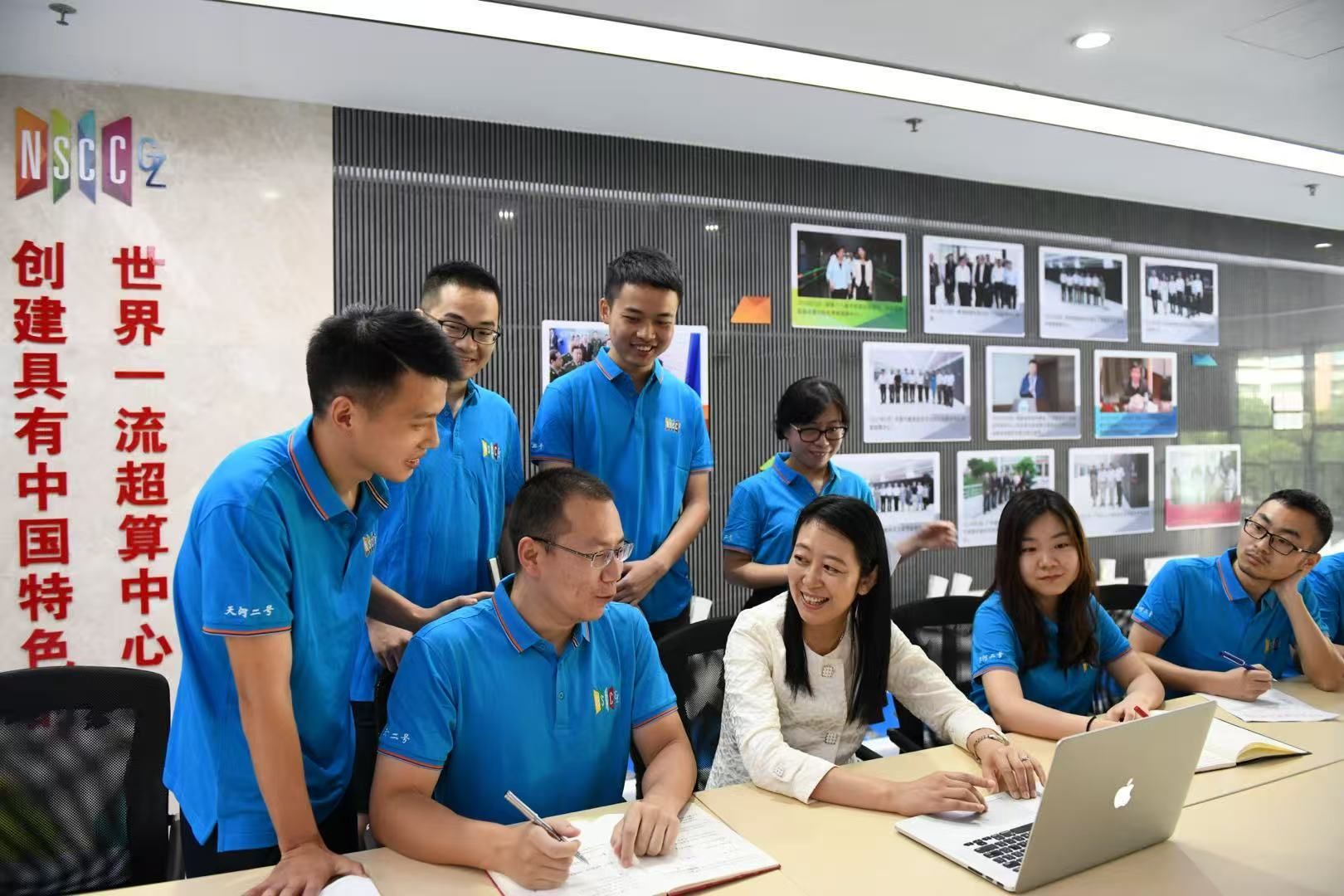 国家超级计算广州中心主任、bat365在线中国登录入口计算机学院教授卢宇彤(前排右三)与同事交流。