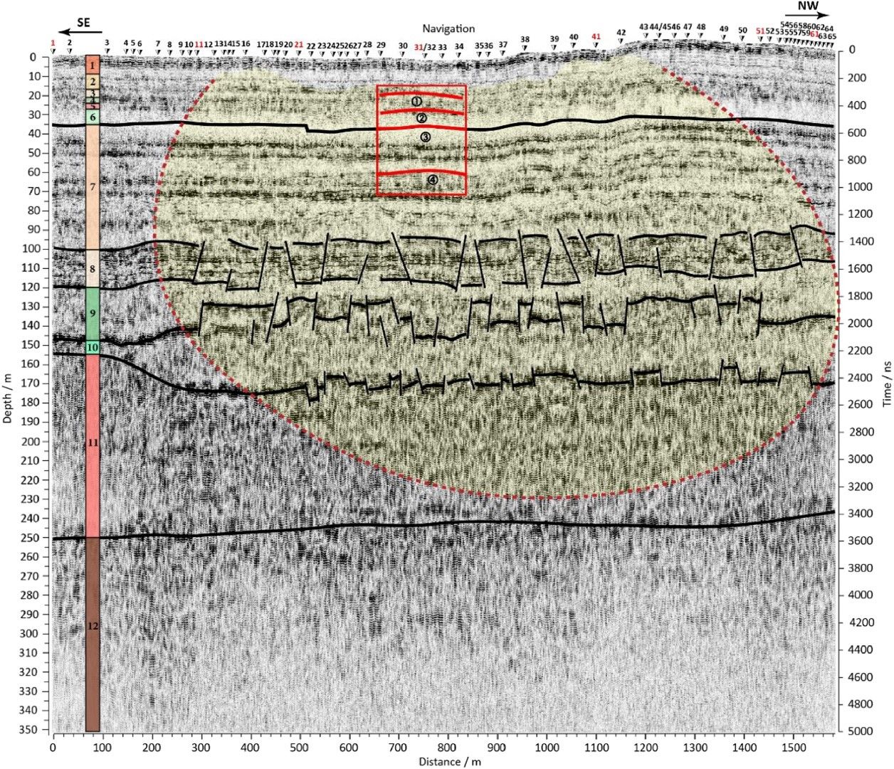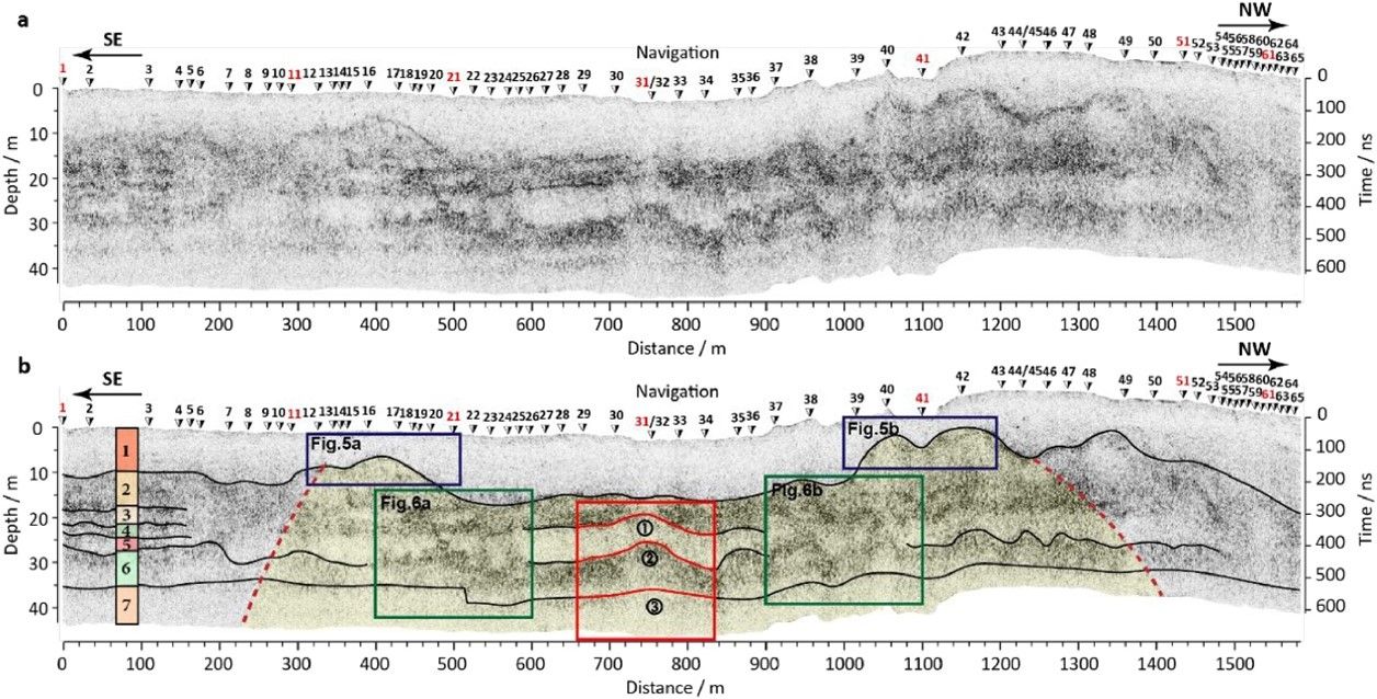 为深入剖析月球撞击事件,张领副教授及其合作研究团队利用中国嫦娥四号任务“玉兔二号”月球车搭载的探月雷达,对长达65个月球日、总计约1600米的巡视路径所采集的数据进行了综合分析。利用其高、低频双通道,实现了从浅到深、清晰连贯的地下结构成像(图2、图3)。